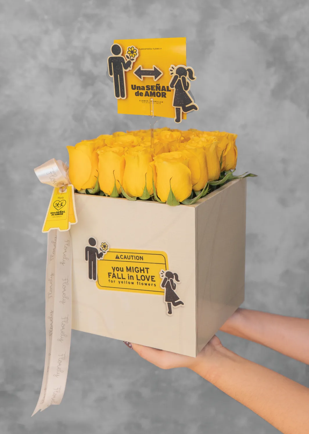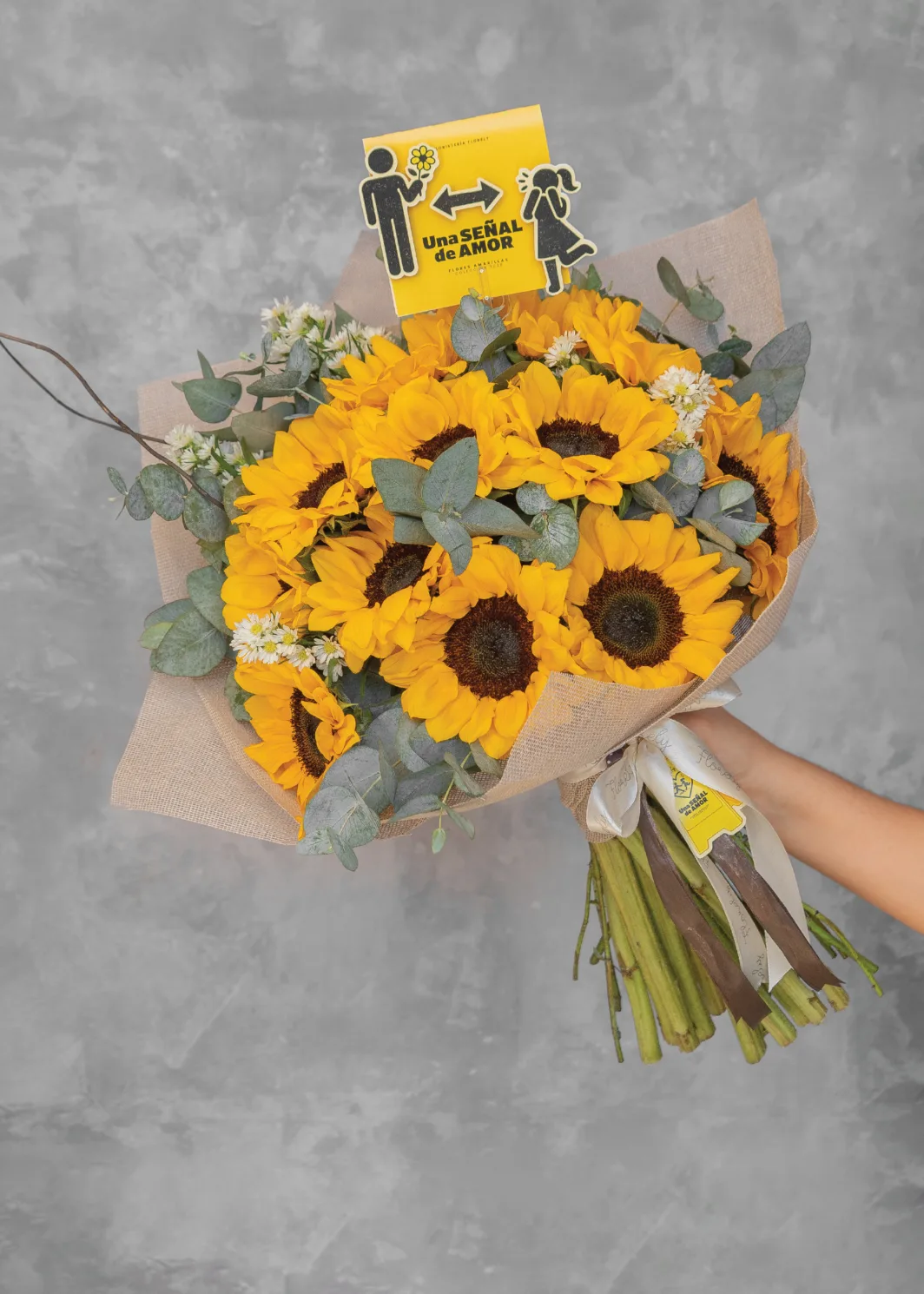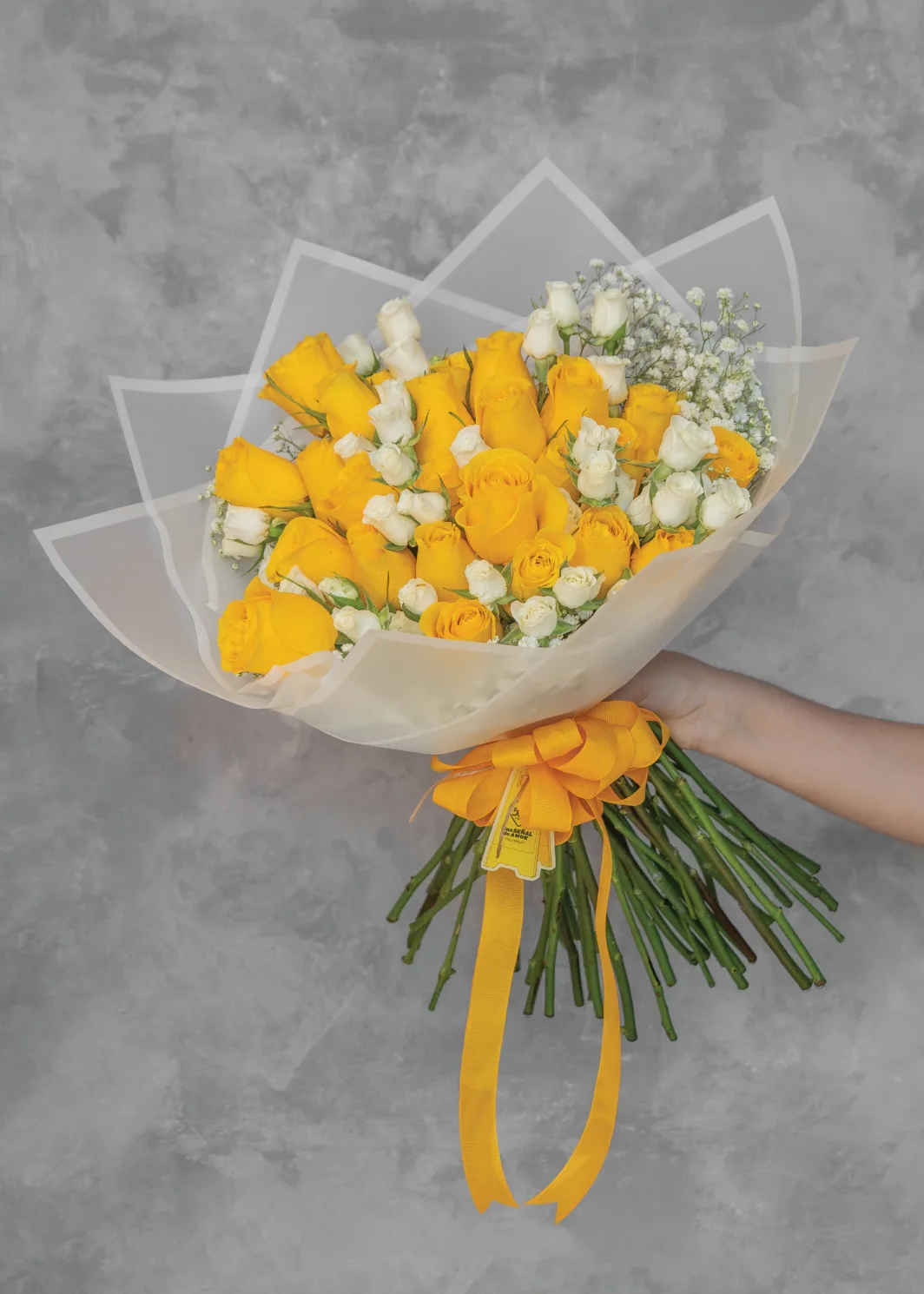 Ramo de flores amarillas asimétrico con medidas aproximadas de 40 cms de largo, envuelto con papel coreano.