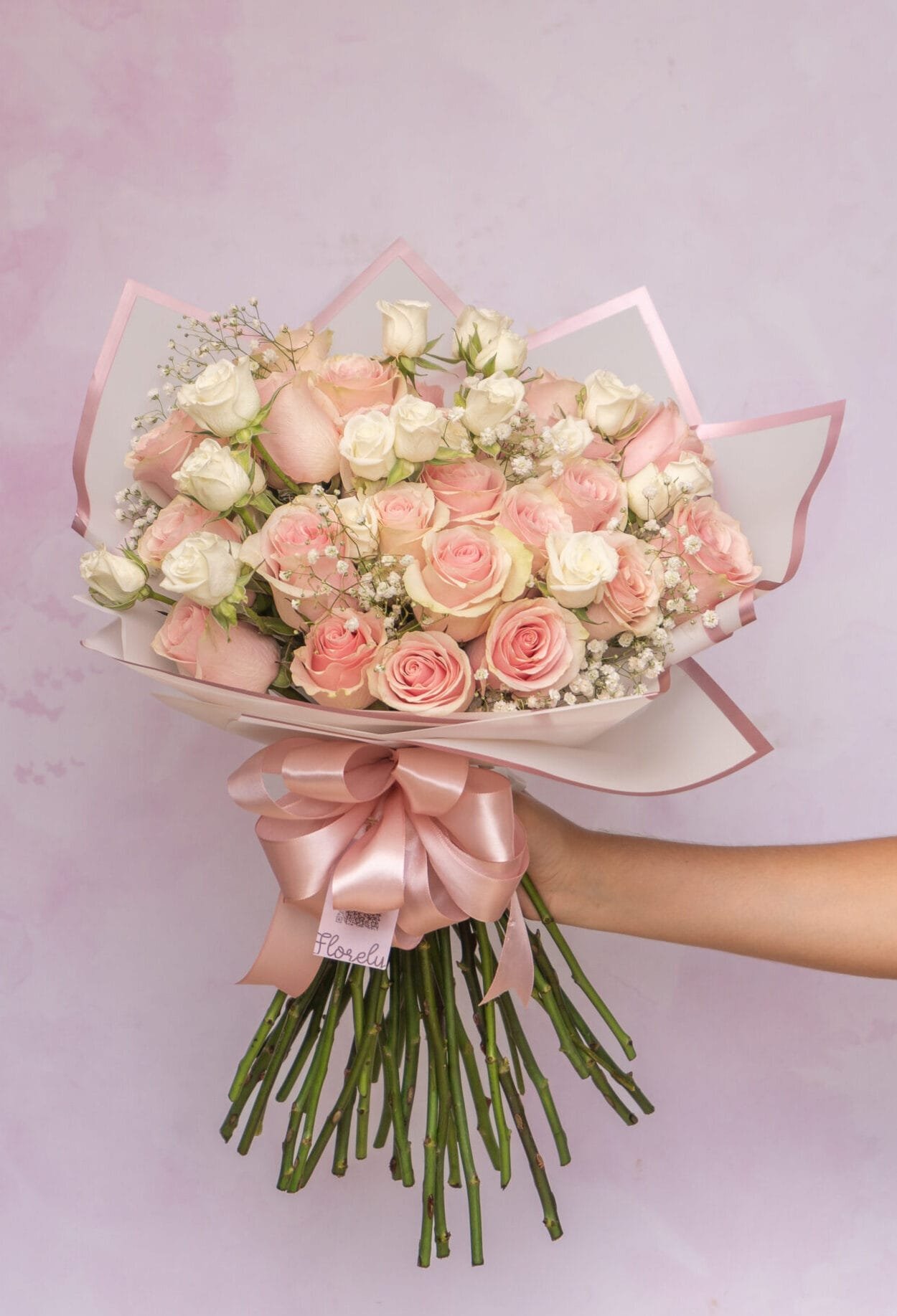 Descripción: Ramo floral redondo, envuelto en papel coreano. (De acuerdo a disponibilidad)