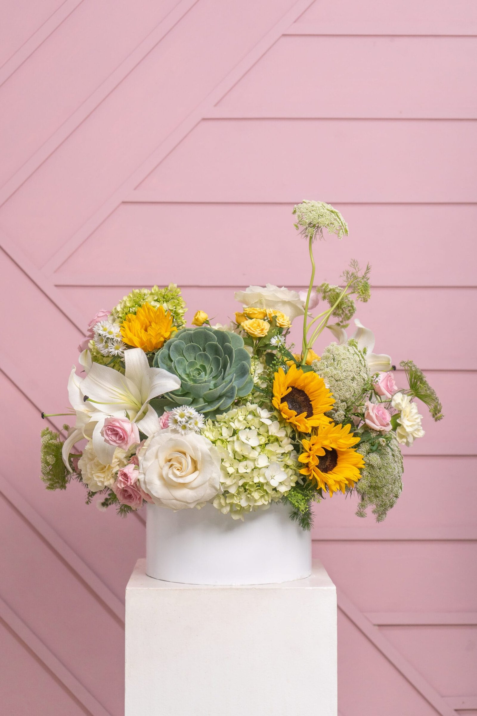 Contenido: Hortensia, Rosas, Girasoles, Ammy, Baby Rose, Lirios, Suculenta.