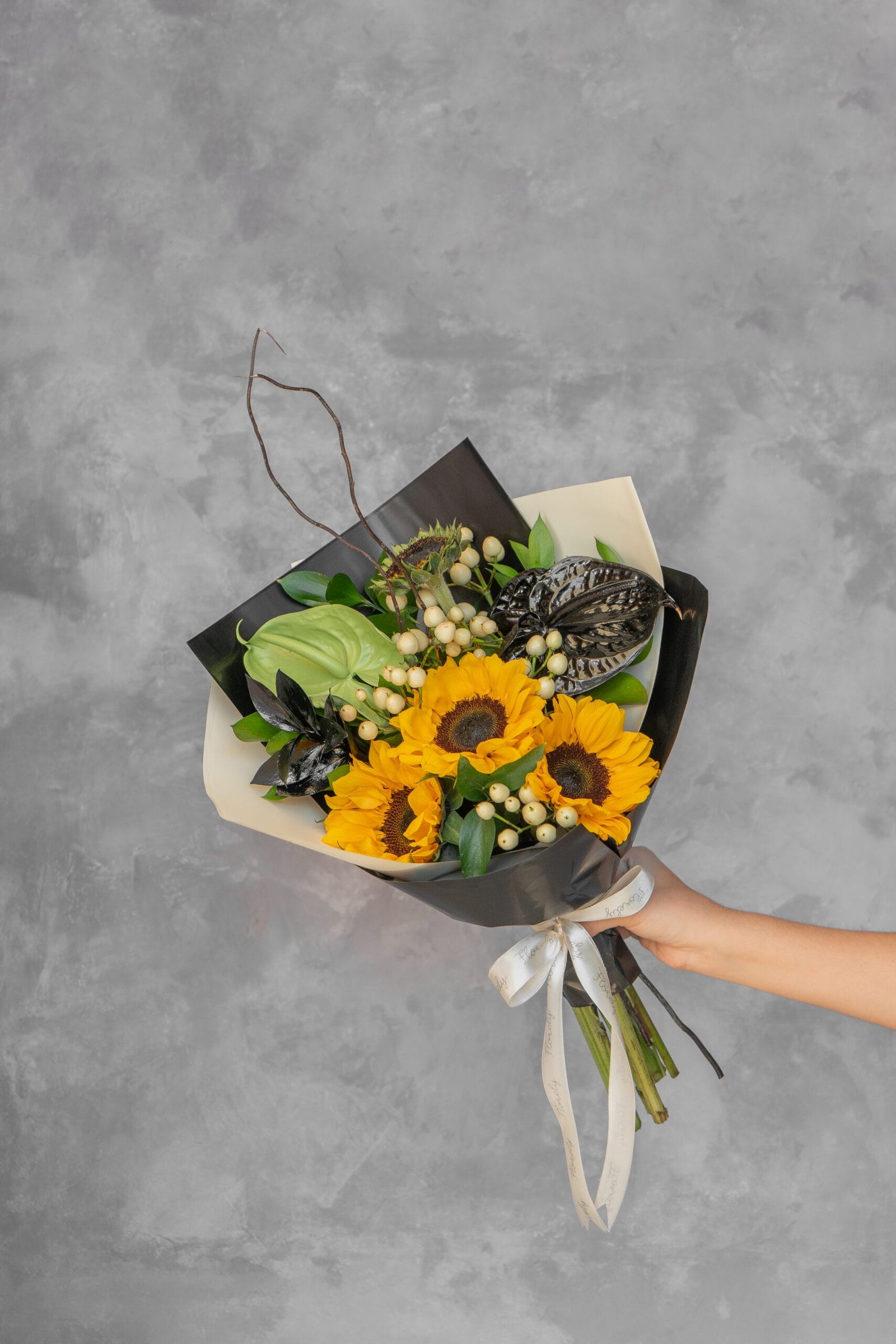3 Girasoles, Hipericum, Anturios y diversos follajes.