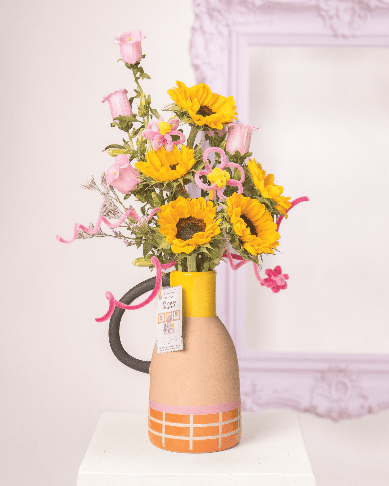Descripción: Diseño floral para Mother´s Day en jarra de cerámica con medidas aproximadas de 25 cm largo x 50 cm alto.