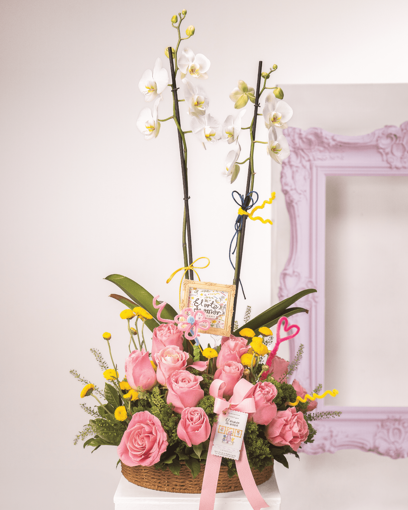 Descripción: Arreglo floral para Mother´s Day frontal en cesta con medidas aproximadas de 45 cm largo y 80 cm alto.