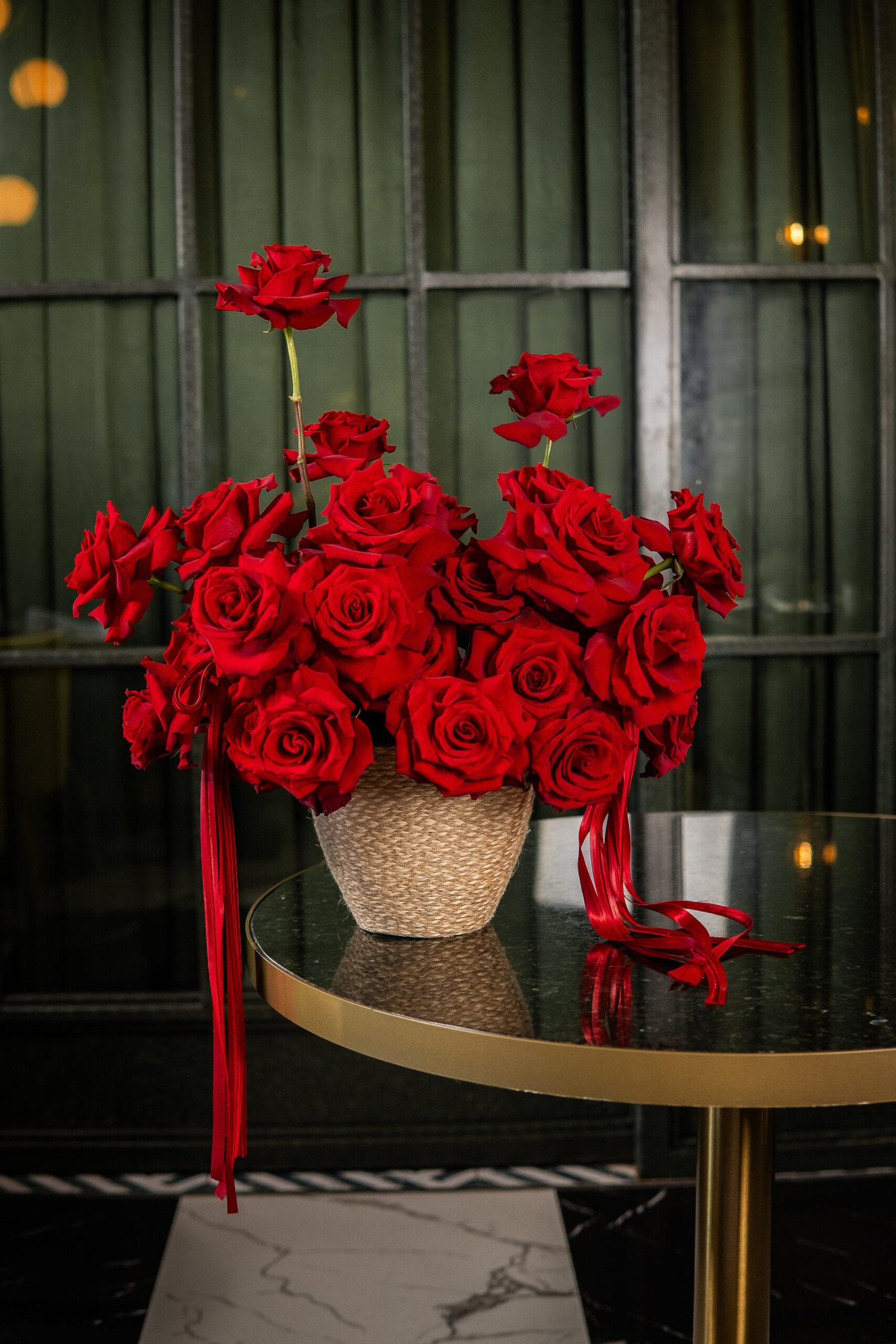 Arreglo de San Valentin asimétrico 360° sobre base cubierta con hilo de yute, con medidas aproximadas de 45 cm de largo x 55 cm de alto.