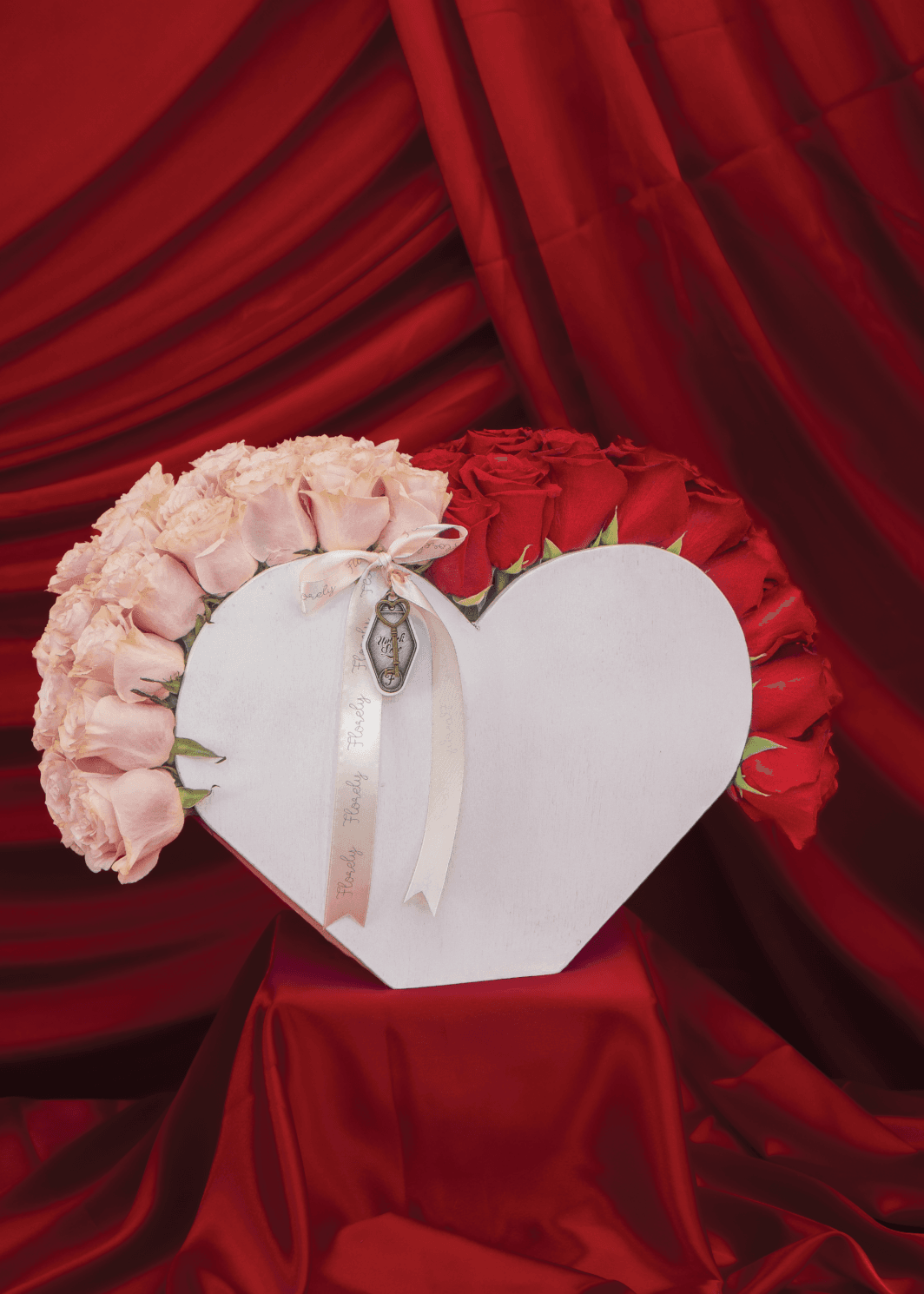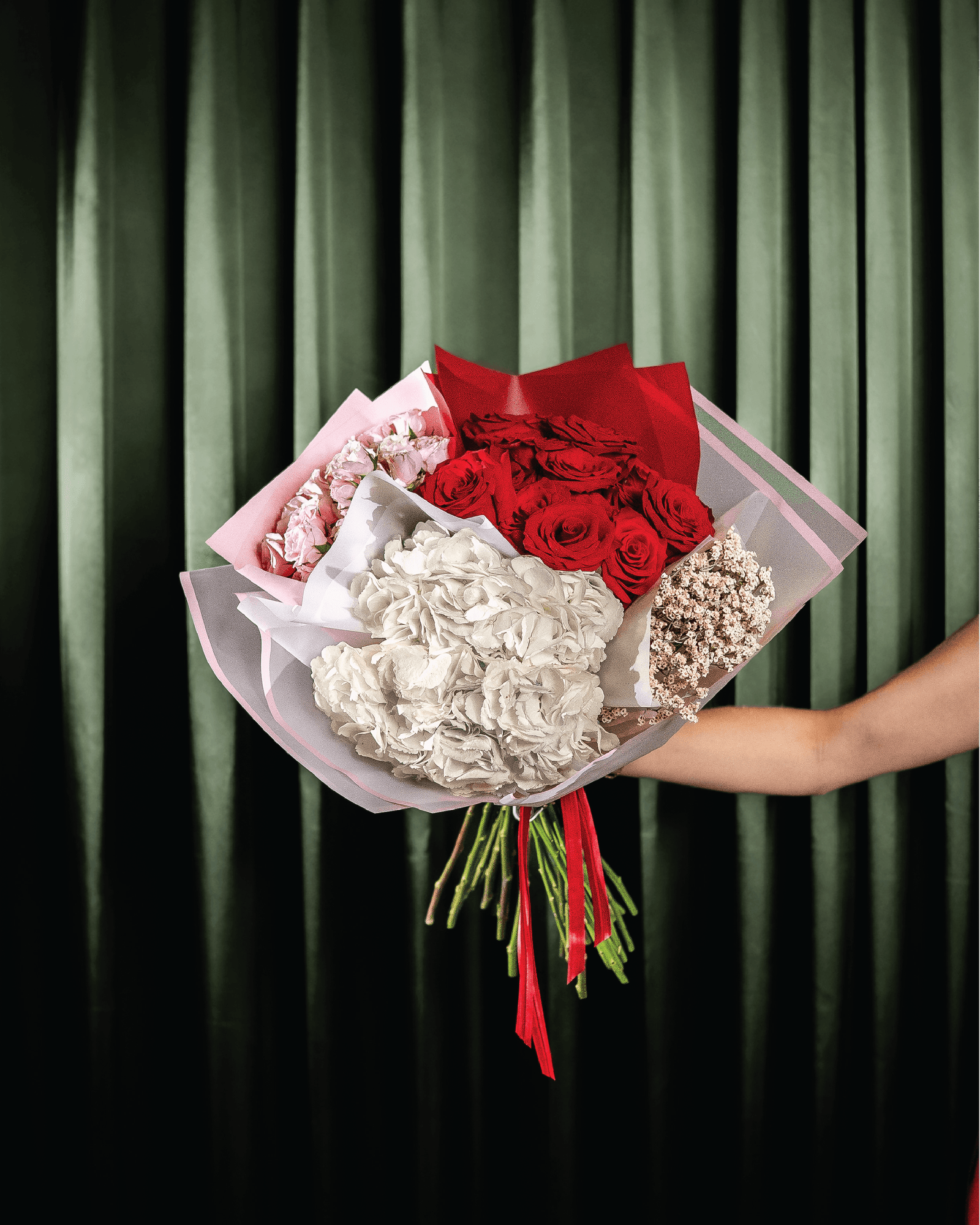 Ramo floral de San Valentin seccionado, con medidas aproximadas de 40 cm de diámetro envuelto con papel coreano.