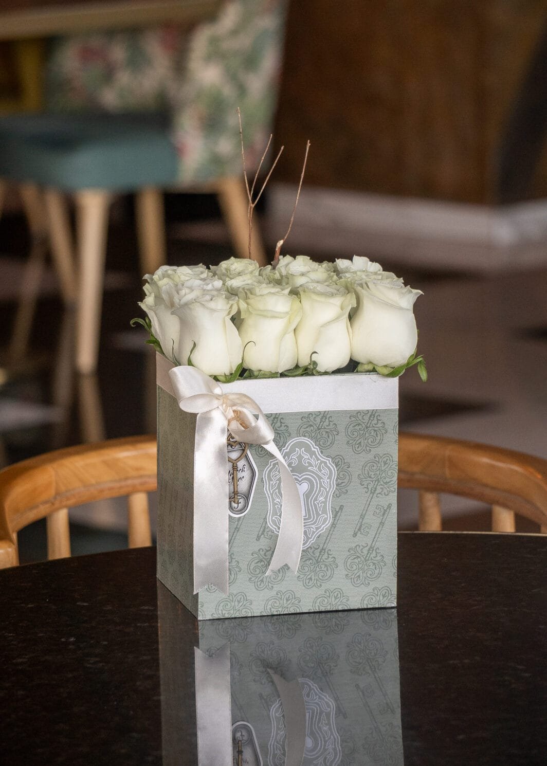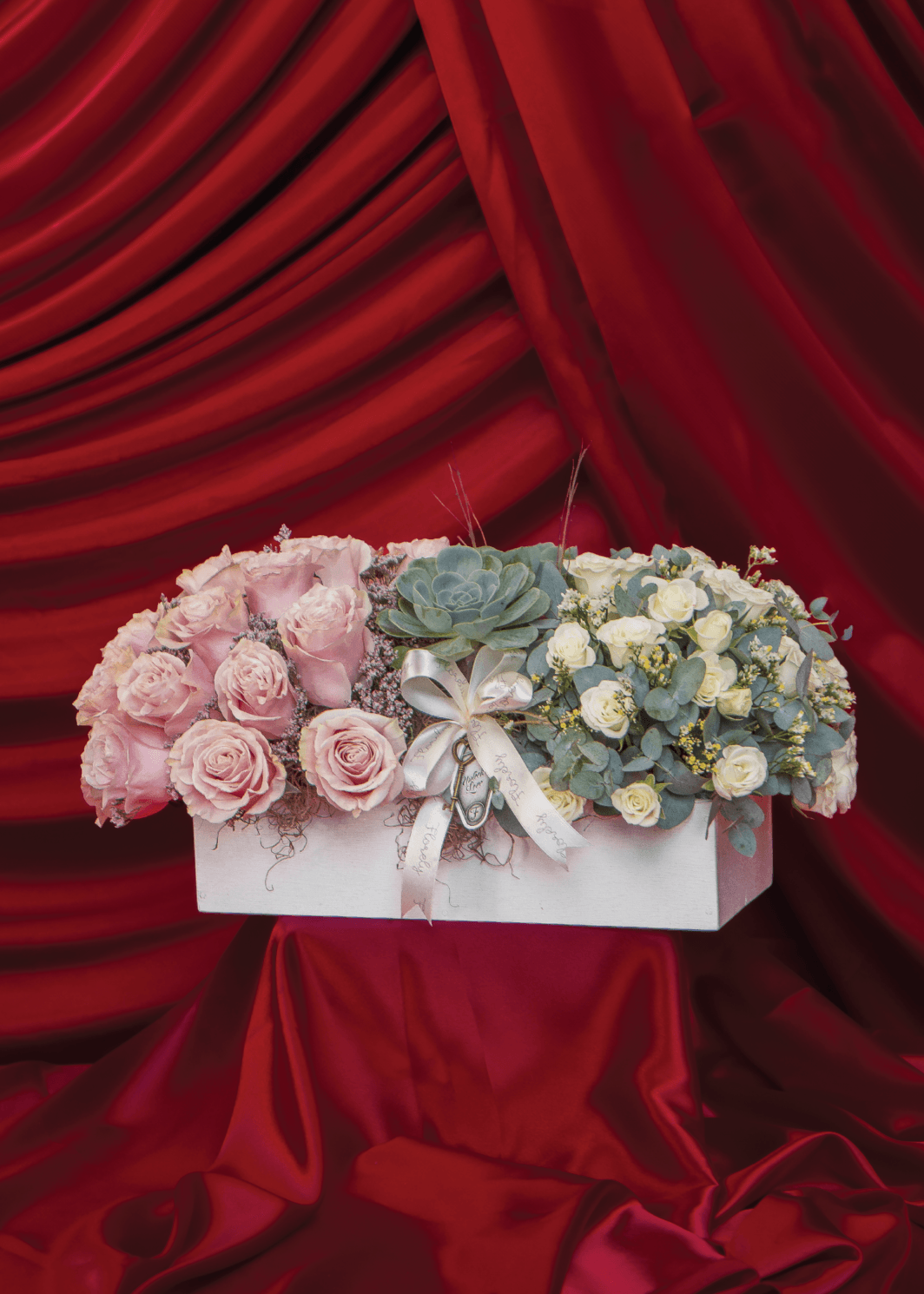 Arreglo de San Valentín en caja de corazón con medidas aproximadas de 40 cm largo x 40 cm de alto.