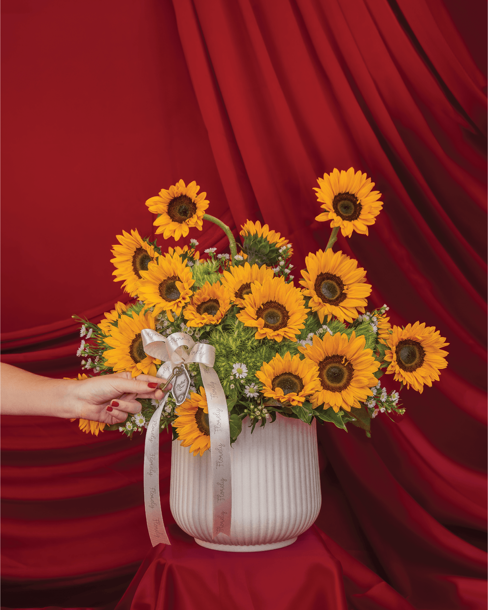 Arreglo de San Valentín 360° sobre base blanca, con medidas aproximadas de 55 cm de largo x 60 cm de alto.