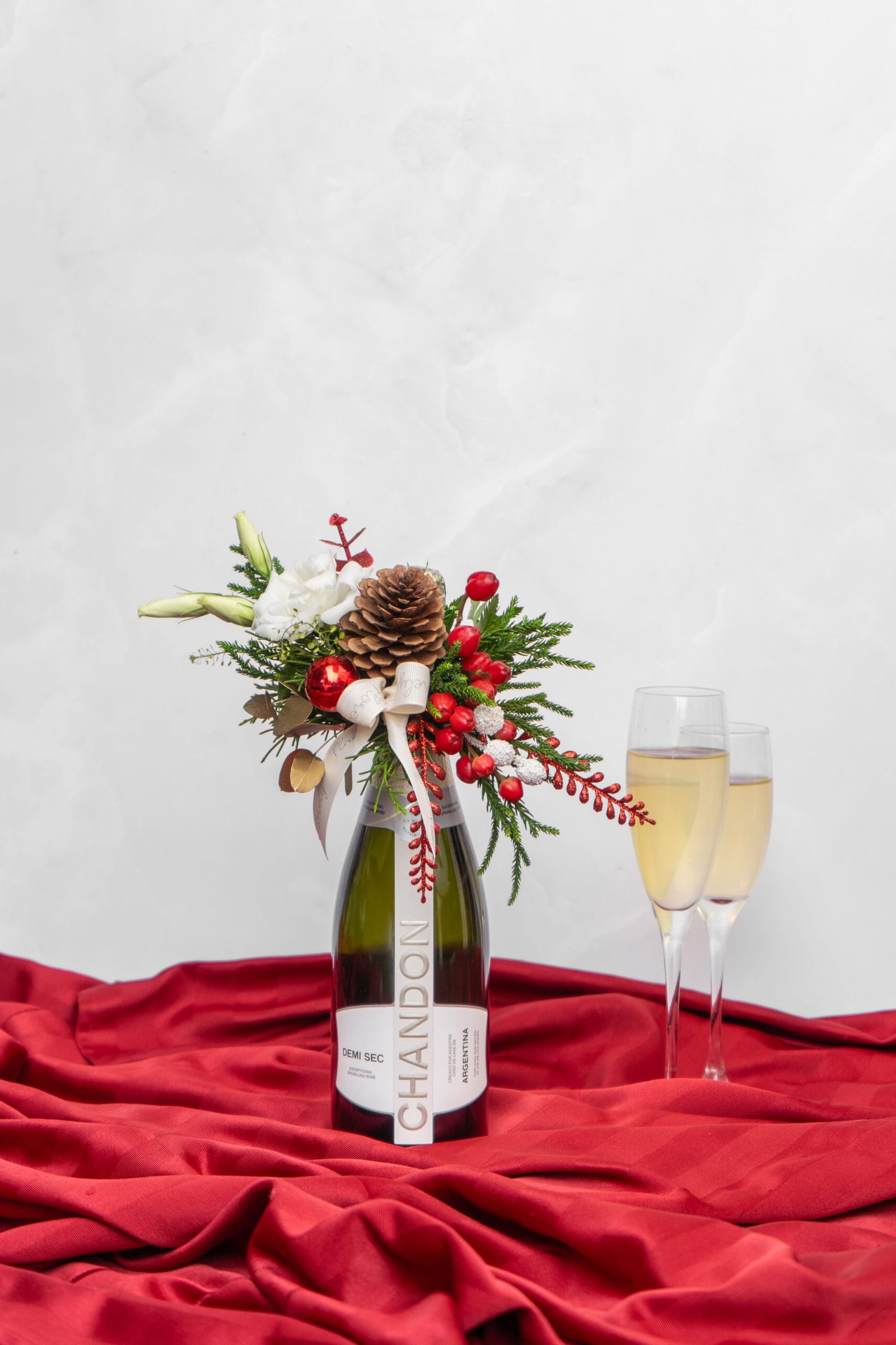 Descripción: Arreglo floral colocado sobre botella de vino espumoso.