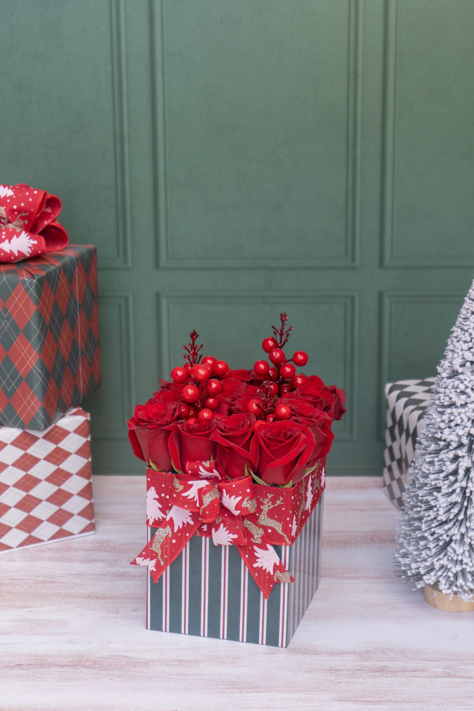 Descripción: Arreglo floral elaborado sobre base rectangular con print de temporada.
